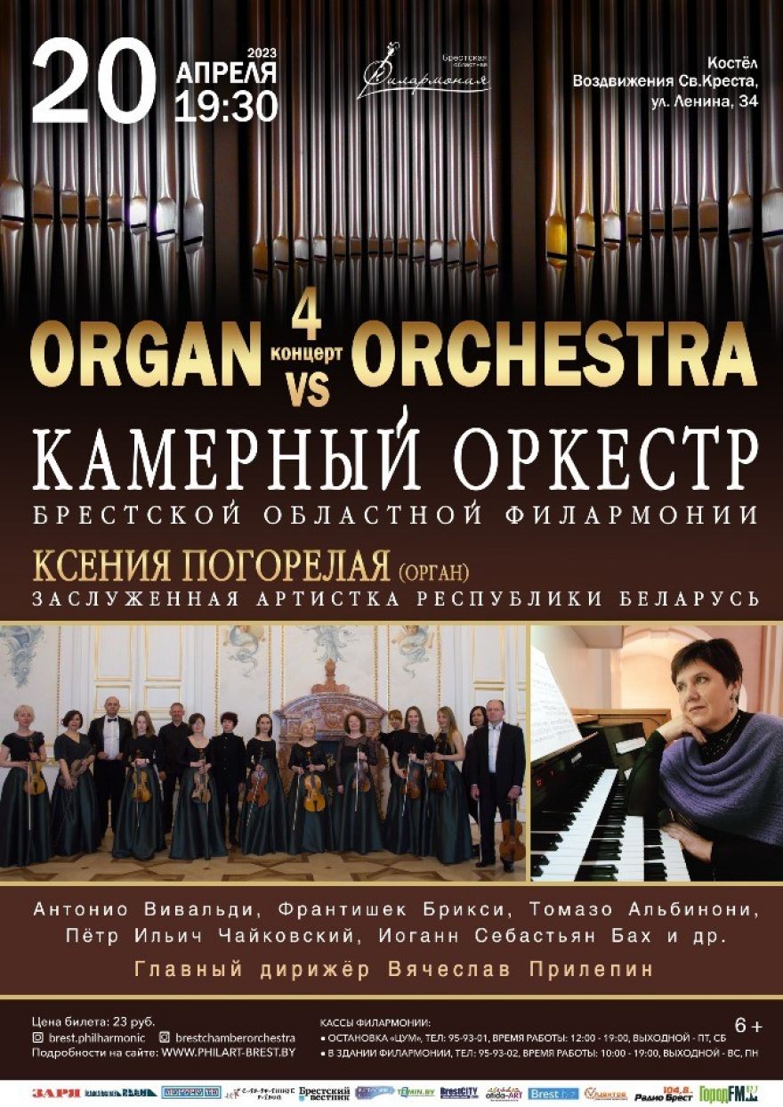 Камерный оркестр Брестской областной филармонии продолжает цикл концертов «ORGAN vs ORCHESTRA» в котором будет представлен уникальный музыкальный тандем: солирующим инструментом с оркестром выступит король инструментов – орган. Как правило, он звучит или соло, или с певцами, или с другими инструментами. Концерты же, где орган становится на сцене партнером оркестра – событие необычное. В качестве солиста выступит Ксения Погорелая.