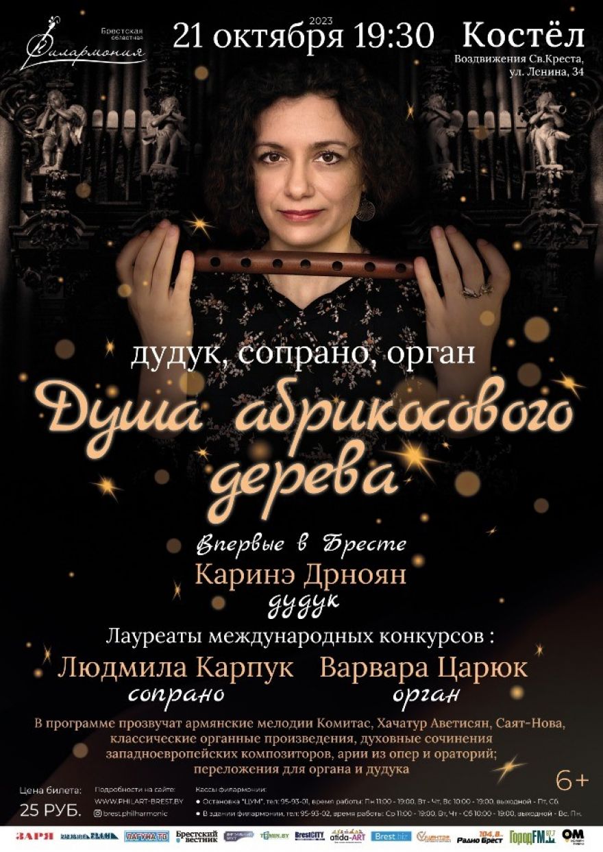 21 октября 2023г в Костёле Воздвижения Святого Креста в 19:30 впервые в Бресте состоится уникальная музыкальная встреча армянского дудука, голоса и органа «Душа абрикосового дерева». В концерте принимают участие известные исполнители: Каринэ Дрноян, армянский дудук / лауреат международных конкурсов / впервые в Бресте